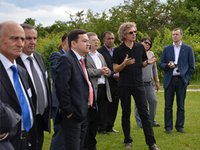 Oberbürgermeister Thomas Nitzsche, Uni-Präsident Walter Rosenthal, CEEC-Direktor Ulrich S. Schubert, Wissenschaftsminister Wolfgang Tiefensee, Infrastrukturministerin Susanna Karawanskij sowie Architekt Hubert Juranek (v.l.) während des Richtfestes für die Erweiterungsbauten des CEEC Jena. Die Batterie der Zukunft soll aus Jena kommen: Auf dem Campus der Friedrich-Schiller-Universität entstehen zwei Erweiterungsbauten des Center for Energy and Environmental Chemistry (CEEC). Auf einer…